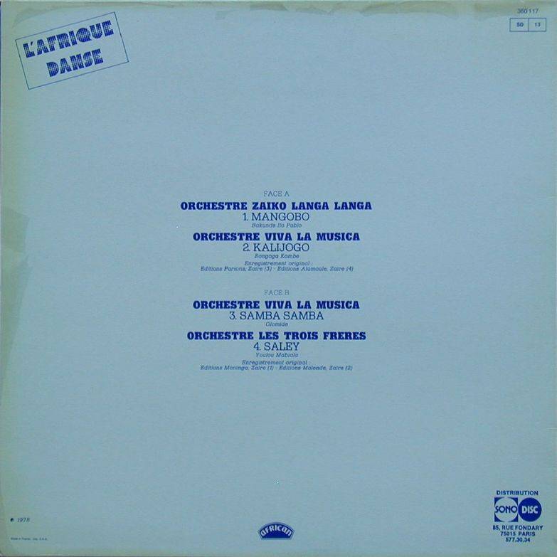 Trois Freres L'Afrique Danse A-01 Mangobo 1 et 2 [x] (Bakunde Ilo Pablo) 9:43 Orchestre Zaiko Langa Langa A-02 Kalijogo 1 et 2 [x] (Bongoga Kombe) 9:18 Orchestre Viva La Musica B-01 Samba Samba 1 et 2 [x] (Olomide) 9:17 Orchestre Viva La Musica B-02 Saley 1 et 2 [x] (Youlou Mabiala) 9:32 Orchestre Les Trois Freres LP total time: 00:00 |