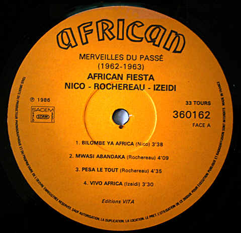Izedi, Nico] Merveilles du passé - African Fiesta 1962 1963 A-01 Bilombe Ya Africa [x] (Nico) 3:38 African Fiesta A-02 Mwasi Abandaka [x] (Rochereau) 4:09 African Fiesta A-03 Pesa Le Tout [x] (Rochereau) 4:35 African Fiesta A-04 Vivo Africa [x] (Izeidi) 3:30 African Fiesta B-01 Rythmo Ya Suka [x] (Rochereau) 4:05 African Fiesta B-02 Moto Abungaka [x] (Nico) 3:45 African Fiesta B-03 Vidas [x] (Nico) 4:52 African Fiesta B-04 Toyei Na Sango [x] (Nico) 3:36 African Fiesta LP total time: 00:00 |